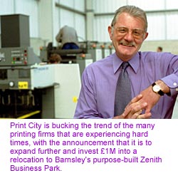 Print City is bucking the trend of the many printing firms that are experiencing hard times, with the announcement that it is to expand further and invest £1M into a relocation to Barnsley's purpose-built Zenith Business Park, just off the M1 motorway.