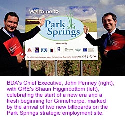 Shaun Higginbottom of GRE and BDA, said: "The recent arrival of new billboards is significant because they signal the start of real development on the site after years of hard work by all the partner organisations involved. Marketing of the site is very important, and we're working very hard to ensure that potential investors that could bring jobs to Park Springs know what we have to offer. The next stage of our marketing will be the launch of our new website, enabling 24-hour access to information on park Springs and Grimethorpe to potential investors all over the world. Nearly 90 new jobs are set to be created in the area when construction of four advanced factory units is completed by Yorkshire Forward this summer, and that is just the start of what we hope could be a massive job creation programme over the next 5-10 years."